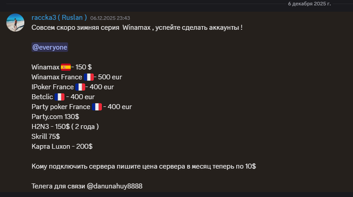 1.07.2025 Приобрёл у CEO Poker connect Руслана raccka3 услуги по верификации аккаунтов winamax и skrill за 250 USDT