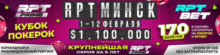 🏆 Более МИЛЛИОНА ДОЛЛАРОВ гарантированных призовых, более 20 уникальных турниров, широчайшая палитра из развлечений и настоящий покерный отдых! Ждем вас в Минске с 1 по 12 февраля на рекордном RPT PRIME, где мы в компании единомышленников ярко и масштабно вместе будем открывать новый покерный сезон 2026 года!