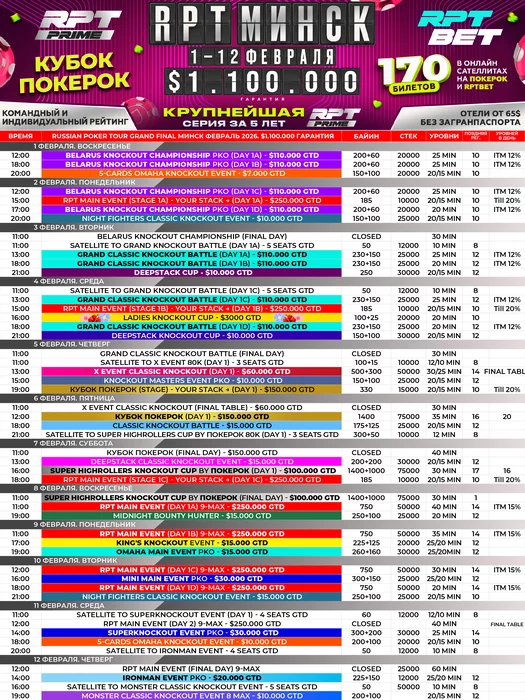 🌟 Турнирное расписание получилось супер насыщенным: в нем 23 уникальных турнира, из которых сразу 5 событий — с гарантией $100,000+. Предыдущий RPT PRIME стал рекордным по многим показателям. Учитывая внушительную гарантию и 170+ билетов, которые будут разыграны в онлайн-сателлитах в румах RPTBET и ПокерОК, мы уверены, что этот первый этап RPT в 2026 году побьет сразу несколько наших рекордов.
