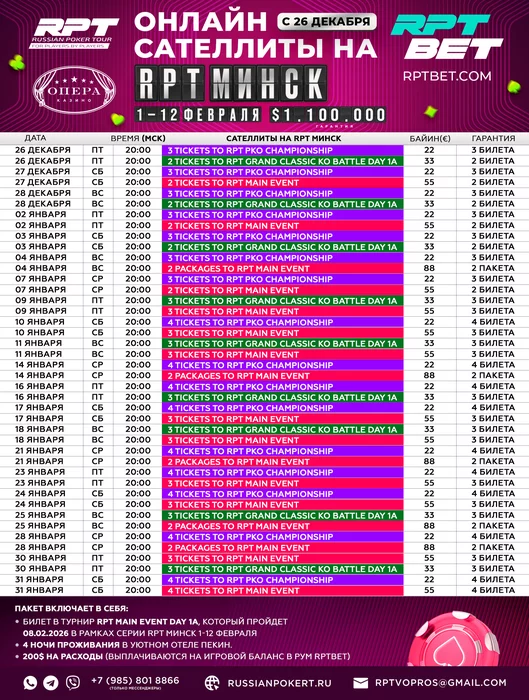 🚀 125+ билетов и пакетов с проживанием — с 26 декабря на RPTBET стартуют онлайн-сателлиты к февральскому RPT PRIME в Минске! ⠀ 🚀🚀 Больше месяца отборочных сателлитов и 125 гарантированных билетов (по традиции для Минска, разыграно будет гораздо больше). Пройти отбор, выиграв билет или пакет с проживанием, можно в три самых массовых и популярных турнира серии RPT PRIME 1-12 февраля: ⠀ 🟢 Belarus PKO Championship — 57 билетов по $260; 🟢 Grand Classic KO Battle — 24 билета по $380; 🟢 RPT Main Event — 44 билета по $750 (включая 10 пакетов участника, стоимостью более $1,300 каждый); ⠀ 🚀 Начать игру можно с фрироллов, добираясь по цепочке в финальные сателлиты. Бай-ины в сателлитах демократичные и доступные для большинства.