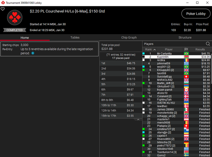 Сегодня меня как обычно очень много и грязно переезжали, но это не помешало сделать пять финалок и закончить сессию в хороший плюс. Утром снова сделал две финалки в куршевель и бадуги. Потом через сат отобрался на Boogie Badugi и в нём сделал финальный стол, но не сложилось, занял 7-ое. Ну а лучше всего сегодня отыграл в куршевель хай-лоу. Утром занял 2-ое, а вечером 1-ое. По ощущениям, опять недобрал баксов 200-300. Ну как есть.