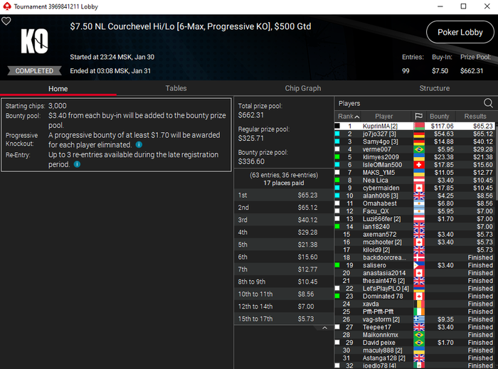 Вчера удалось за одну сессию выиграть сразу три турнира по разным дисциплинам: куршевель хай-лоу, лоуболл и бадуги. Все они есть в списке обучения. Оставляйте заявки на обучение, если хотите начать развиваться в других покерных играх и так же тащить по три турнира за сессию. Более подробно о вчерашней сессии писал у себя в личном блоге.