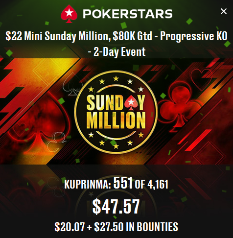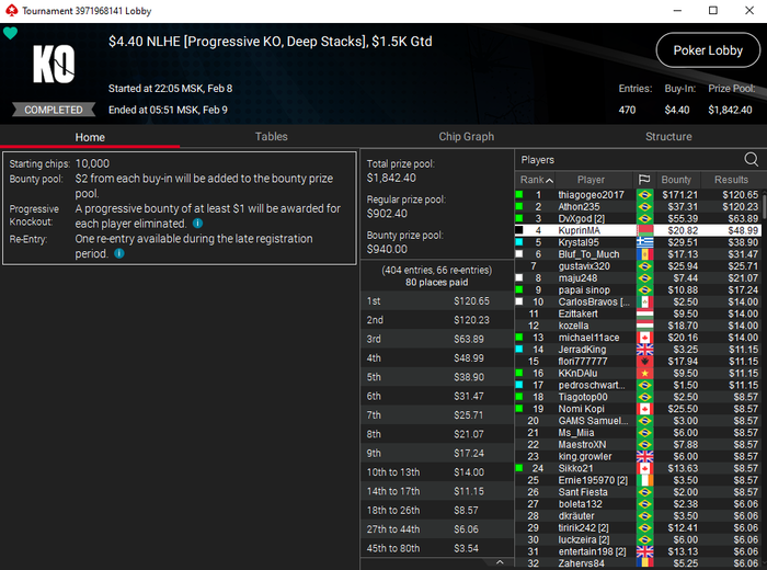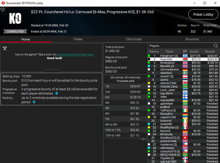 Когда собирался кэш в стад хай-лоу и разз, то делал и больше. Сейчас играю только МТТ, а с учётом того, что турниров по моим дисциплинам не так много, а ABI низкий, то до 2К добивать уже сложнее, но можно. Для этого просто нужно больше играть, а я сутками не играю. Ну или выиграть хотя бы два турнира по 22$, где за первое в районе 400-500$. Но этих турниров вообще по одному в неделю. Их только недавно добавили. И проходят они только в пятницу и субботу.