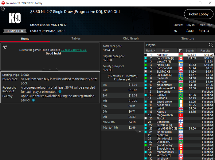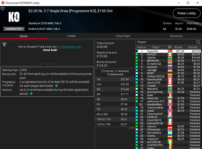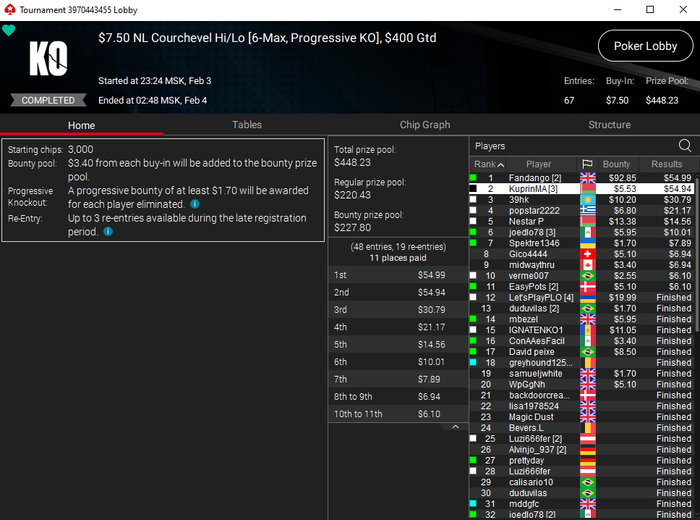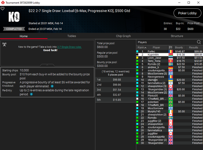 Я специализируюсь в основном на дро играх, т.е. играх с обменом карт. Ну и плюс куршевель хай-лоу и холдем. А игры по типу ХОРСЕ, стад, разз, 8-игр и т.п. я так же умею играть, но играю в них очень редко. В стад хай-лоу раньше плотно в кэш играл, но сейчас игры просто нет. Ну а по моим дисциплинам турниры начинаются от 2.2$ и заканчиваются 27$. И на сериях ещё бывают мои дисциплины с бай-инами побольше. Стараюсь их не пропускать. Но даже играя ABI 3$ можно делать 2К$+ в месяц, что вполне неплохо. При этом не нужно гриндить по 600+ турниров в месяц, по аналогии с холдемом. Здесь у меня в каждом конкретном турнире максимальное ожидание, как можно заметить хотя бы по результатам на скринах.