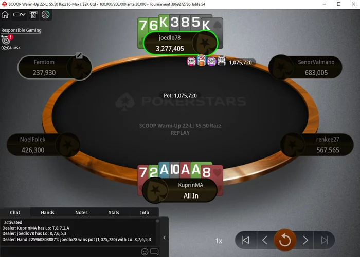 На неделю выпадал из игры, так как попал в больницу с аппендицитом. Более подробно об этой ситуации писал в своём личном блоге. Прямо в больничной палате удалось оформить парочку первых мест, а по возвращению домой выиграл небольшой дневной бадуги. При чём в самом начале турнира остался с 2 бб, но даже это не помешало раскрутиться и выйти за финальный стол огромным чиплидером. Ну а дальше доработать уже было делом техники.