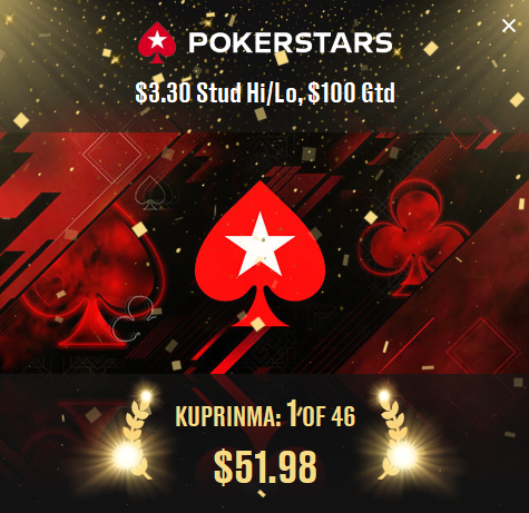 Сегодня с утра снова захотелось покидать 7 карт. В этот раз запрыгнул на последних секундах лейтреги в стад хай-лоу. Удалось раскрутиться и выиграть. Всё-таки большой наигрыш в кэш по раззу и стаду дают о себе знать, хотя МТТ по ним я не играю. Потому что тут важно следить за экшеном и сброшенными картами, запоминать ауты, а делать это, играя несколько столов, не всегда получается. Но сегодня получилось. Очень нравится, что в покере я всесторонне развит. Что уж скромничать. Денег в этом турнире немного выиграл, но главное сам результат.