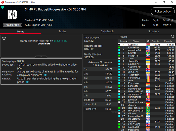 Вчера был близок к победе в 22-ом лоуболле, где за первое было около 300$, но в концовке не сложилось. Очень много и грязно напереезжали. Ну а сегодня с утра уже успел занять первое место в бадуги.