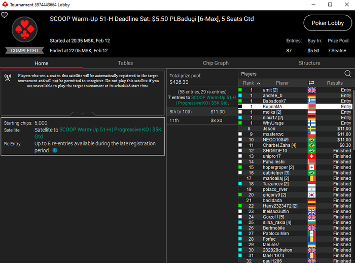 После операции ещё тяжело даются долгие покерные сессии, но зарабатывать нужно. Вчера отыграл очередную хорошую сессию. Начал с сателлитов на куршевель хай-лоу и бадуги. Сыграл 4 сата - все выиграл. В целом было много финалок и побед. Подробно описывал сессию в своём блоге. В общем за вечер насшибал по мелочи баксов 250+ где-то, хотя должно было быть 600+. Ну как есть.