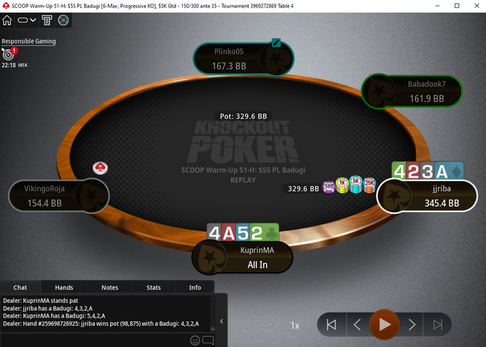 В 3-мах в глубоких стеках сыграл очень хорошую скилловую раздачу. Не знаю даже чему больше рад, победе или этой раздаче, но точно знаю, что она попадёт в копилку к моим обучающим материалам по бадуги.