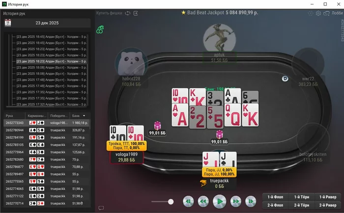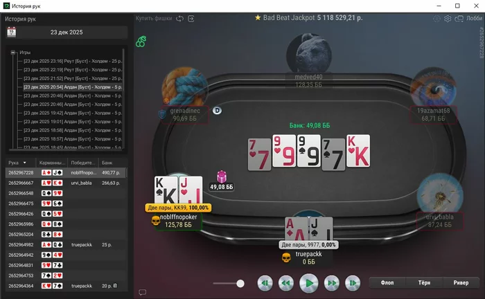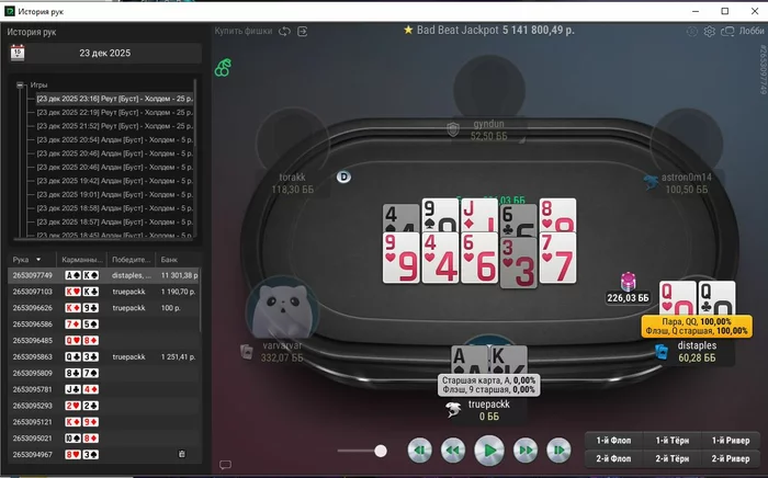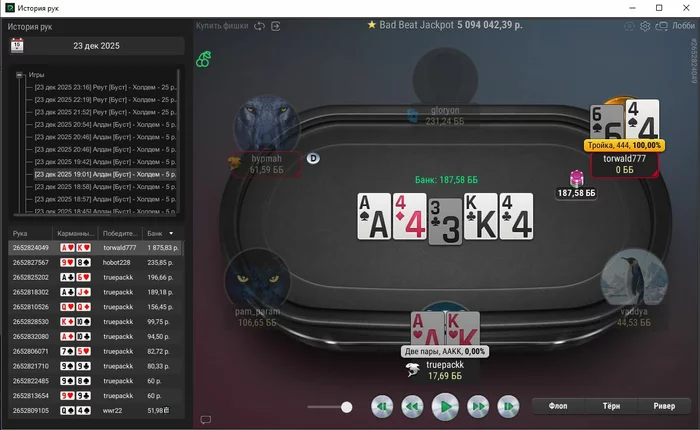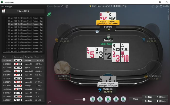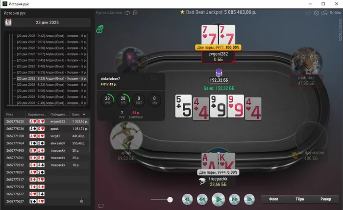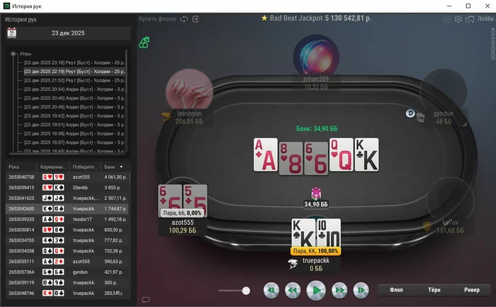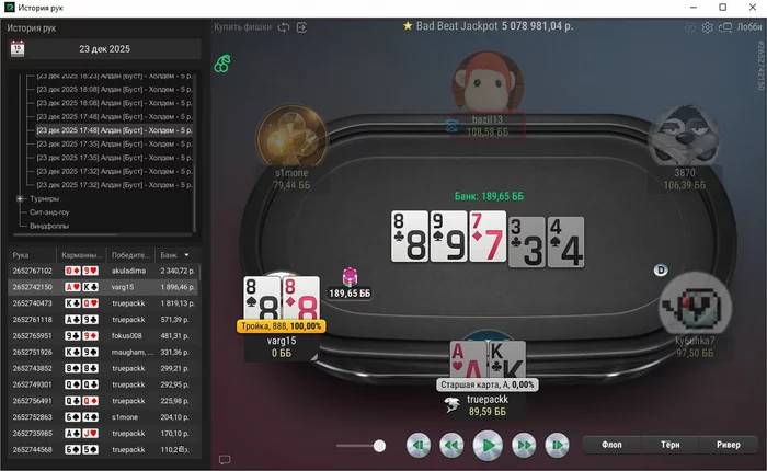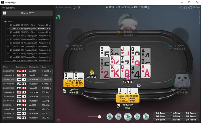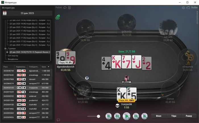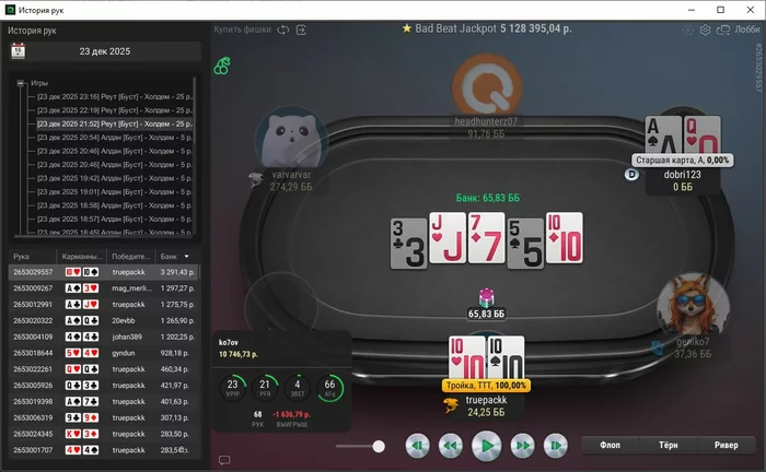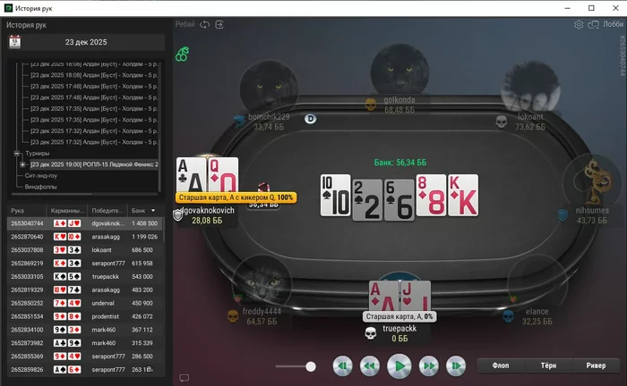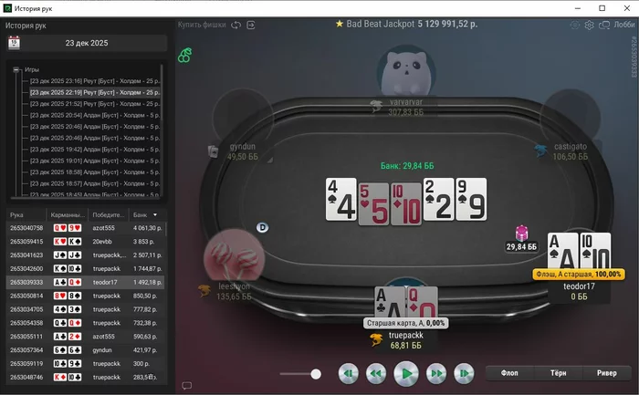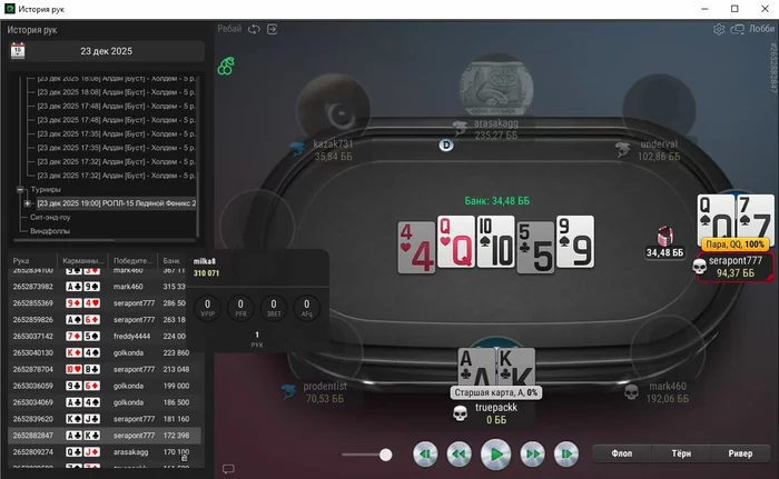 Единственная рука, с которой не выставился префлоп, тут ривер выставился, чел помечен фишом,