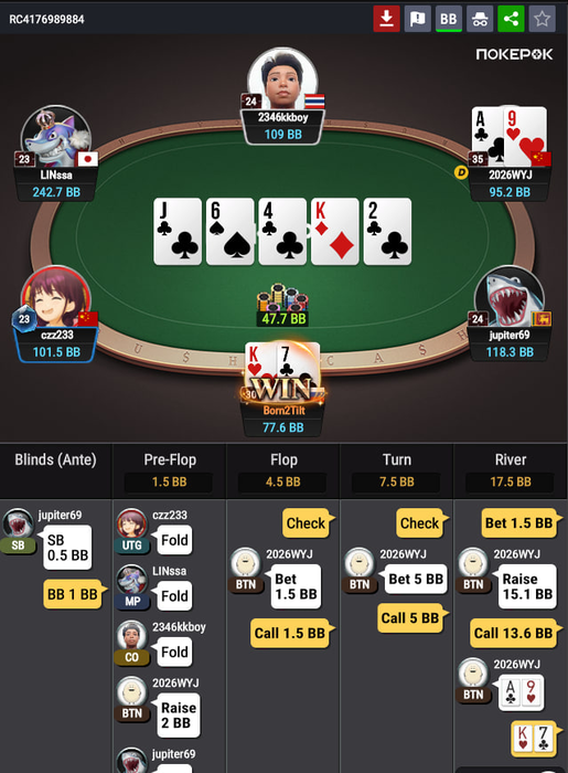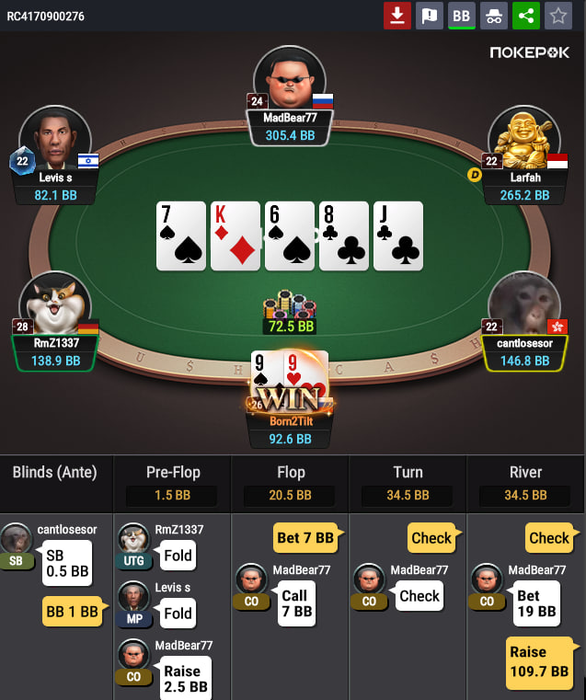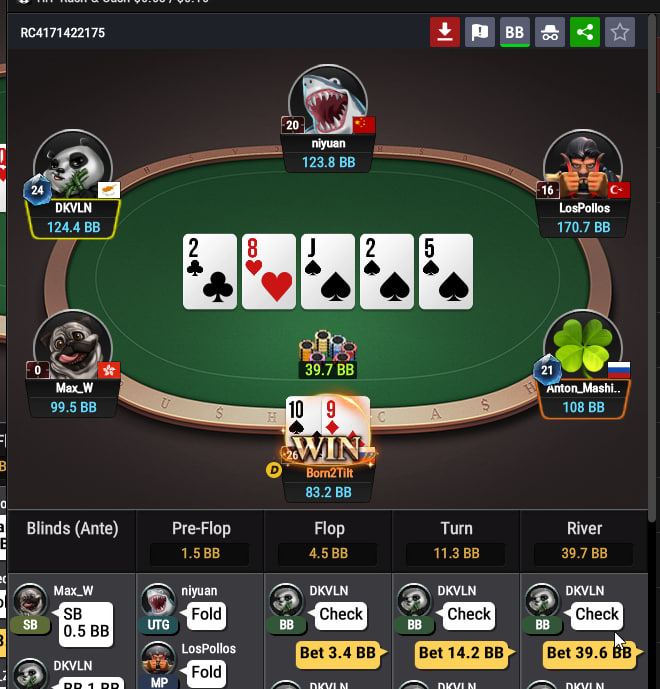 На терне нам пришел стрит вроде как и хорошо, но и не совсем когда нам уже играют чек/рейз на закрывшейся флэш доске, но мы не можем отскакивать и ронять, так как у нас стрит и все еще есть J в масть, но если уже смотреть постфактум на это все, то как будто на тех лимитах где играешь ты нужно призадуматься что если не приходит пика и нам пушат то придется бросать, так как там поле мало блефует да и тем более подумай что там оп нам может наблефовать так то