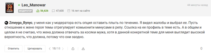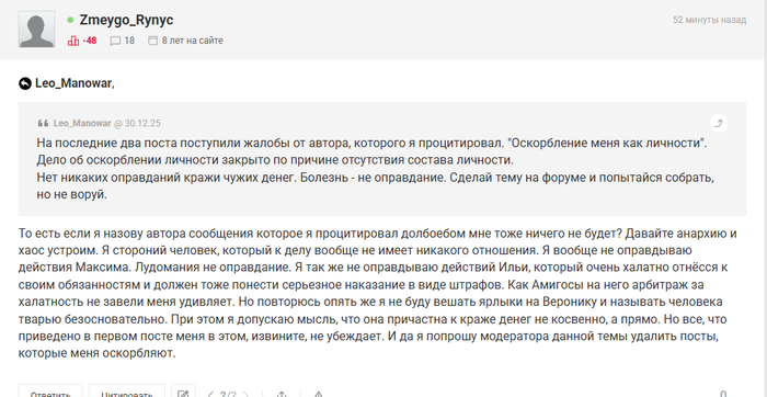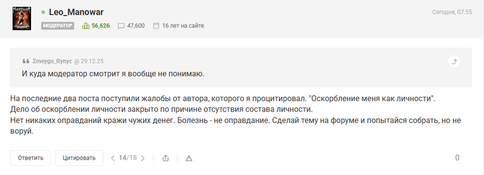 В данной теме https://forum.gipsyteam.ru/index.php?viewtopic=181049 я увидел сообщение 1 скриншот и позволил себе написать пост, который расходится с данной точкой зрения. Пост можно прочитать на странице 6. В ответ на пост от этого же человека я получил 2 сообщения следующего характера скрин 2. На эти сообщения мной была подана жалоба модератору данной темы с формулировкой оскорбление моей личности. На что был получен ответ от модератора скриншот 3. На мой встречный вопрос скриншот 4, был получен ответ, что модератор видел жалобы и видите ли "решил" плыть по течению скриншот 5. Просьба удалить посты которые меня оскорбляют, а к модератору Leo_Manowar применить санкции вплоть до увольнения за халатное отношение к своим обязанностям.