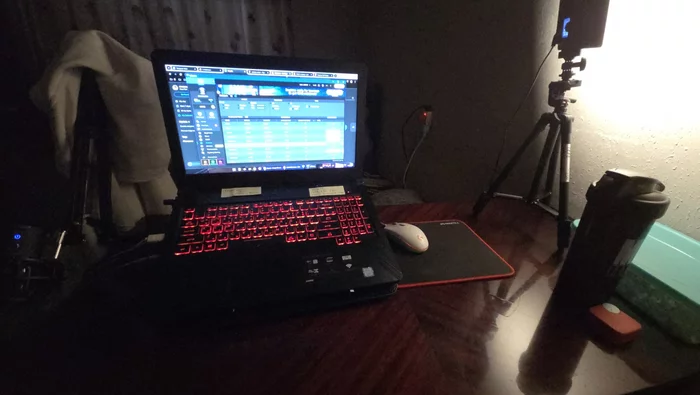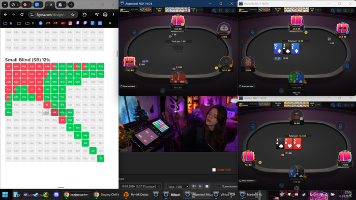 3 стола, чарты+статнейм слева, твич с музычкой, куда можно смотреть пока руки в пасе, и снизу подсчет сыгранных раздач – цель 700 (сегодня выходной)