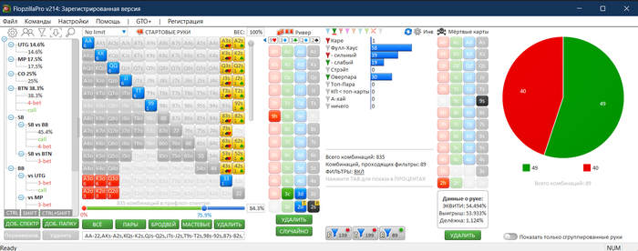 В итоге сел и попробовал разобрать во флопзиле. Не помню их впип, но поставил примерно 75. И посмотрел какие возможные комбы мог бы отколоть фиш. Зеленым отметил то, что я бы бил, а красное – то, что бьет меня. И походу мой пуш впорядке. походу пуш +EV решение было. Узнал что еще есть окасца и оверпары, которые фиш вполне мог бы отколлоть на мой взгляд. Окасца еще и слабые фулики с двойками могут быть, которые я бью.
