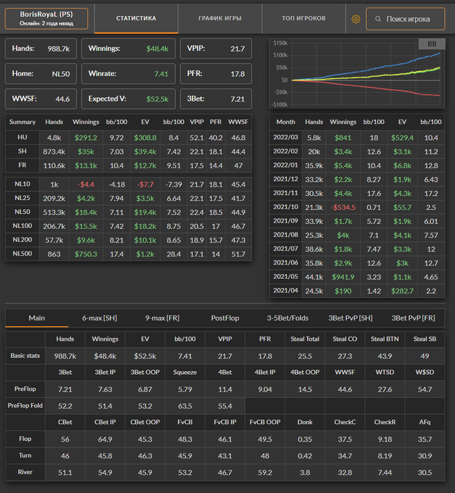 С уходом старзов, пришлось искать себе новое место для игры. Раньше часто слышал такое мнение, что на старзах было самое сильное поле, которое тяжелее всего побить, так как там играли самые лучшие игроки. В реальности оказалось совсем не так. Старзы были тёплой ванной: огромное множество любителей, открытое лобби и понятная система селекта. Даже ограничение на 4 стола, как раз помогало селектить лучшую игру. И, самое главное, там был очень низкий рейк. Как оказалось таких бонусов не было ни в одном другом доступном евроруме. Поняв, что дело туго, решил прибегнуть к помощи фонда. Основной целью было узнать, где вообще прибыльно играть кешивику, ну и подтянуть теорию и, возможно, социализироваться с одногрупчанами) Подал заявку в Гринлайн. Там мне рассказали и показали, что есть какие-то мобильные приложения, эмуляторы и вот это вот всё. Довольно быстро привык к софту и показывал какие-то подобные предыдущим результаты. Спустя три месяца игры от Гринлайн, решил продолжить карьеру самостоятельно, так как имелся собственный банкролл и в бекинге я не нуждался, а плата за обучение казалась дороговатой.