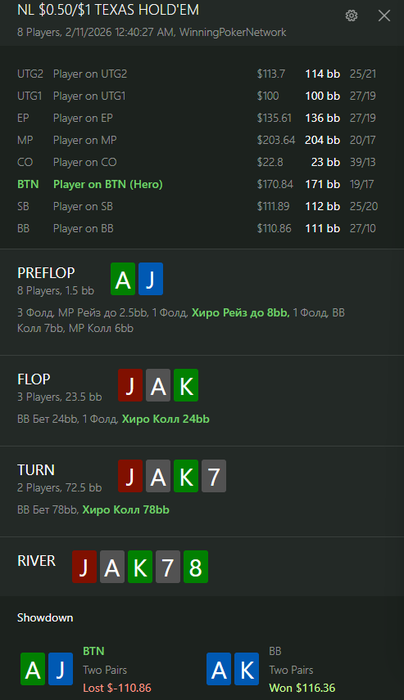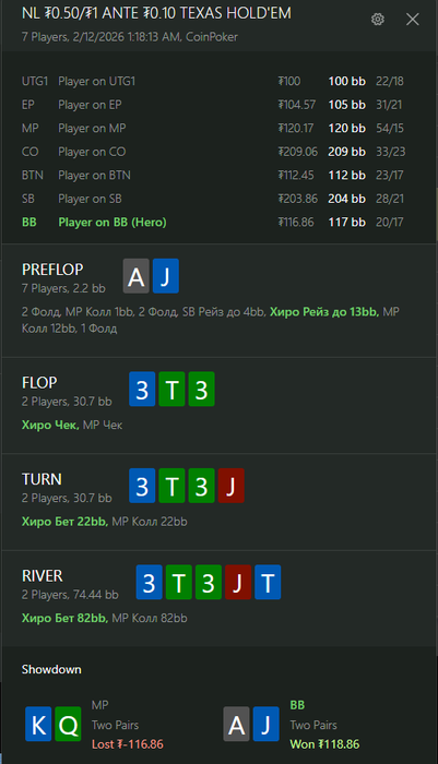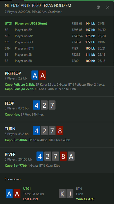 Исход сессии решила последняя крупная раздача, к сожалению неудачная для меня. Решил чуть подслоуплеить тузов на флопе, за что был наказан