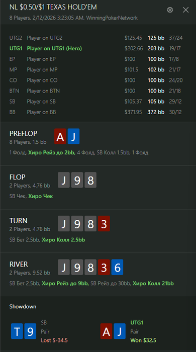 А в этой раздаче, похоже, переборщил и лучше такое исполнять против СО или BU, у которых будет побольше комбинаций мелких флешей и блефов (оппонент рег, рук было мало в моменте)