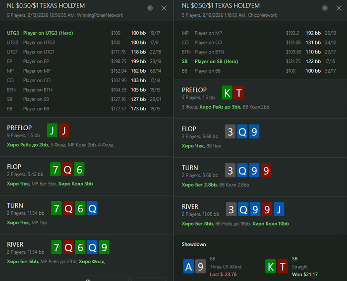 Ещё заметил, что любители частенько слоуплеят трипсы, чтобы потом зарейзить на стрёмном, даже для трипса, ривере и сломать мне голову. В левой раздаче оппонент после моего фолда показал Q3o.