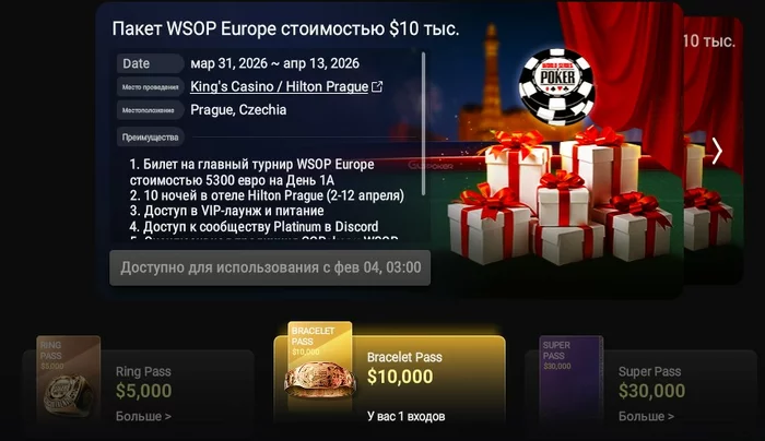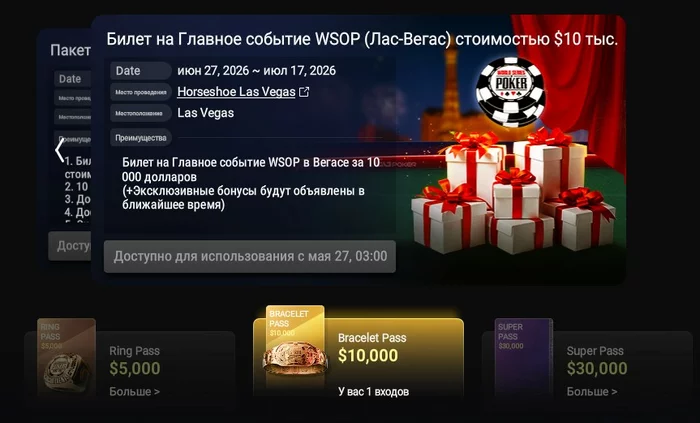 Продам Bracelet Pass, срок годности 1 год, можно использовать как бай-ин WSOP ME, WSOP Europe в Праге.