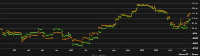 Комментировать нечего, ран конечно дичь. Сел играть, познакомился с парнем за столом, поболтали под катку, тоже играет в казино, все подняться не может, я как понимаю все кто микросы катает, у всех одна проблема, ну пока болтали, катал, не думал. По итогу что то там в ноль натыкал. А после началась полная задница, чуть не успевал встать в топ по лб, думаю дай страдлы поставлю, по итогу на страдлах укатал долларов 16(укажу полосу на графике), по факту то же, что и получил за лб. догнал топ3. Ну и тут понесся недобор, за 500рук 3 раза в каре, тузы на тузах, не смог чет как будто перестроиться что блеф 4 бета нету, 3 банки с АК пихает один человек на лимит, плюс смотря на впипы 13, пфр 7, 3бет 2 желания 4бетать в блеф и 3бетить полярно и сетмайнить отпадает. Бесконечные мультипоты, короче все в стиле НЛ2😂 Ну и в самой гонке начал подтильтовывать, не привык я как раньше селектить по кд 9 столов, катать и думать. Ренджи не вел, полный автопилот, но больше всего раздражают колдколы на мп и со, как будто вообще не понимаю что в мультипоте делать. Ну будем завтра снова продолжать. Бывало друг проигрывал 120$ на нл5 за 7к рук, хотя в его компетентности и режиме антипоплавка я не сомневаюсь, поэтому в раны такие верю, вопрос только в том, сколько залито стеков по моей вине, по ощущением последние 3 точно😅 А вот так когда то шотал НЛ25, так что терпеть умеем.