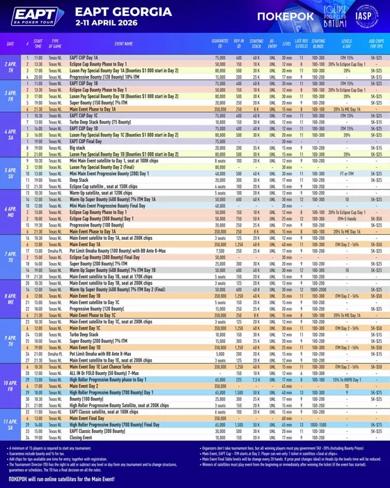 Также ознакомиться с расписанием серии можно на официальном сайте: https://eapokertour.com/tournaments/georgia26