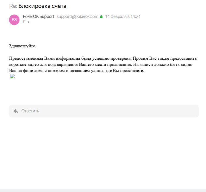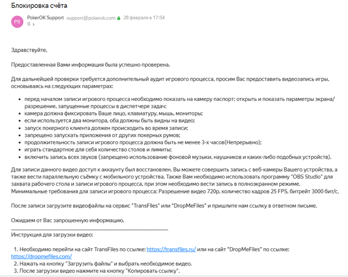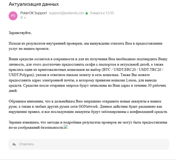 Здравствуйте. Хочу поделиться своей ситуацией и узнать, сталкивался ли кто-то с чем-то похожим на PokerOK. Недавно мой аккаунт был заблокирован службой безопасности. Более месяца проверок: подтверждение данных паспорта и прописки, видео на фоне дома по прописке, 3-х часовое видео игрового процесса (письма из поддержки на скринах)... В последнем письме указано, что мне отказано в дальнейшем предоставлении услуг, однако средства на счёте будут возвращены, причина естественно не указана, хотя на последней проверке 3-х часов игрового процесса НИКАКИХ нарушений с моей стороны не было. Я всегда играла честно и никогда не использовала запрещённые программы или ботов. Аккаунту меньше года, играю в основном МТТ-турниры микролимиты. Последний месяц больше занималась обучением и анализом своей игры, поэтому результаты немного улучшились. Я была готова полностью сотрудничать и максимально быстро оправляла нужные данные для проверки. Я понимаю, что у рума покерОК более сложная и активная необходимость борьбы с нечестной игрой, но очень жаль, что под такую блокировку попадают обычные игроки, которые правил не нарушали. Последняя надежда на разблокировку-это аппеляция или привлечение саппортов рума и других игроков с подобной ситуацией на форумах. Если кто-то сталкивался с подобной ситуацией или успешно подавал апелляцию, буду очень благодарна за советы. Спасибо.