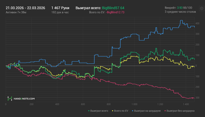 Весь день не мог выиграть ни одного оллина, но оч хорошо шел постфлоп. Все блефы проходили, все велью оплачивались)