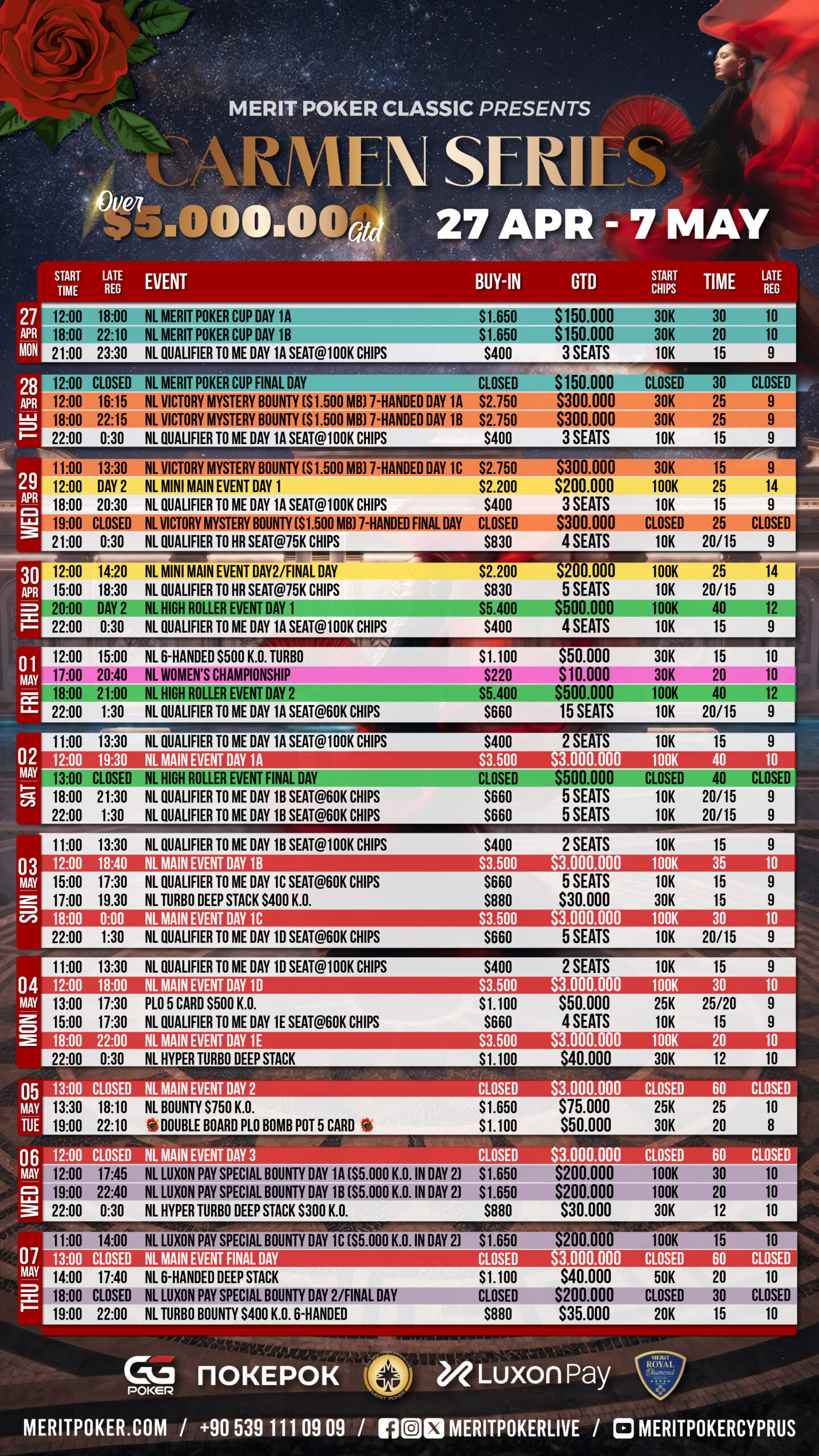 🔻 $3.500 Main Event, $3.000.000 GTD 🔻 $5.400 High Roller Event, $500.000 GTD 🔻 $2.750 Victory Mystery Bounty (7-Handed), $300.000 GTD 🔻 $2.200 Mini Main Event, $200.000 GTD 🔻 $1.650 Merit Poker Cup, $150.000 GTD 🔻 $1.650 Luxon Pay Special Bounty, $200.000 GTD