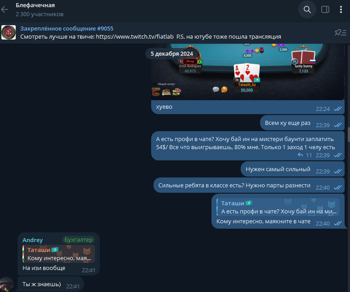 Все началось с того что я в сентябре 2024 года зашла в чат блефача чтобы посмотреть как другие люди играют в покер.
