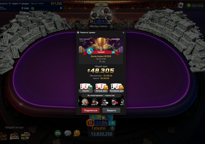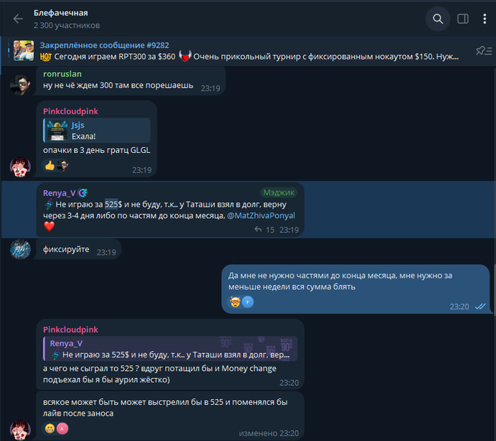 Все началось с 5 декабря 2024 когда я начала некоторых участников чата бекать на турниры с 70$-80%. То есть все что он выигрывает 80% я забираю, остальное его. Кто хотел, тот залетал.