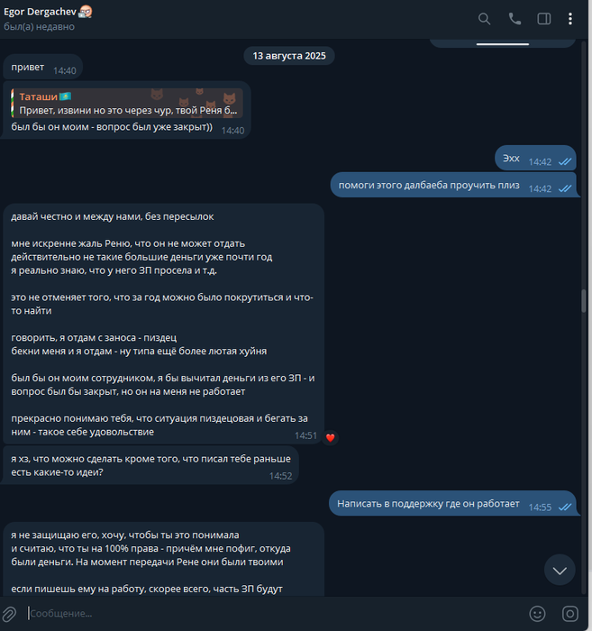 Еще торчу Егору Dergachev около 100 бачей или 120. До этого тоже брала долги и возвращала, но после того как узнала что он защищает Рината, захолдила с долгом пока не решим вопрос