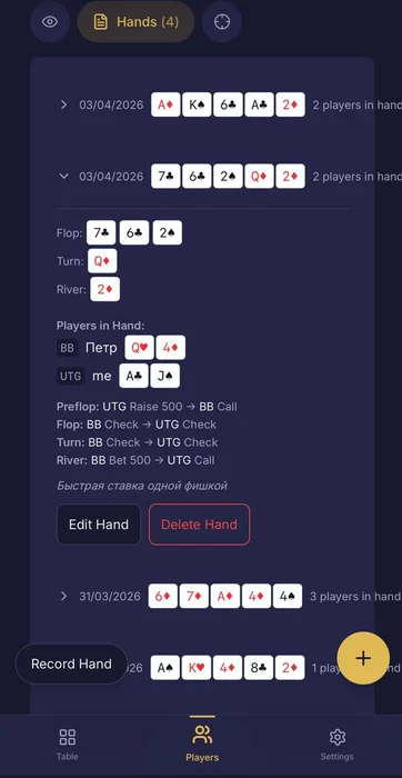 Можно записать ключевые раздачи: кто что делал на каждой улице, борд, результат. Чтобы потом не