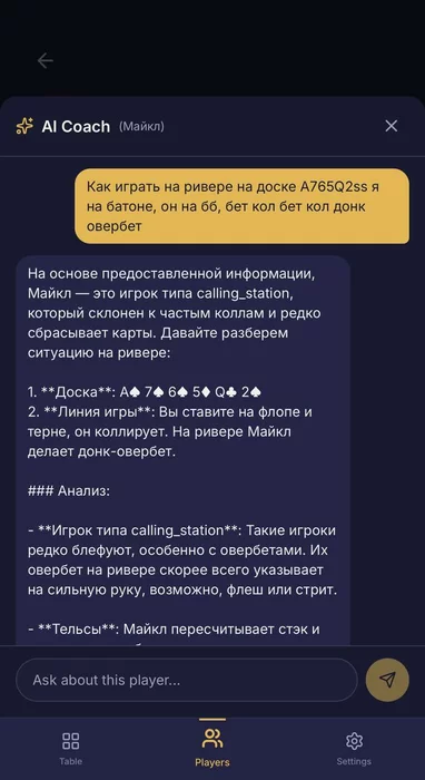 делать когда этот игрок овербетит ривер" — он даёт конкретный план с привязкой к тому, что ты