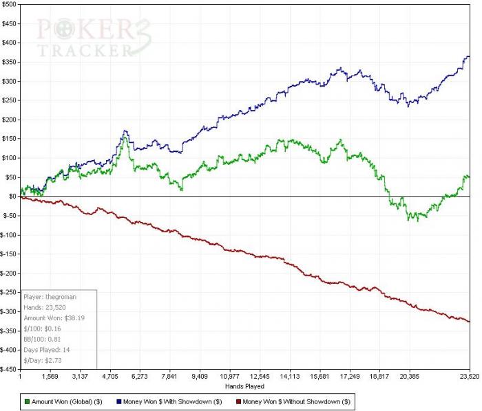 Но потом мне была отвешена жесткая затрещина - ничего в игре не менял, статы те же, игра та же но все игралось в минус. За несколько дней такой темы произошел жесткий залив. За 3000 рук с 380Е до 140Е ...... стрёмно....на графике с 17к по 20к ...