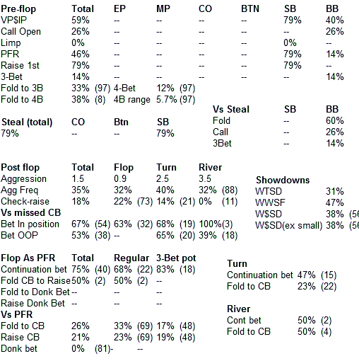 Вообще для обсуждения раздач неплохо бы выкладывать свои статы за эту сессию, такая статистика как рэйз кбета в 3-бет поте почти ничего не говорит об оппоненте не зная как часто ты 3-бетил и ставил кбет.