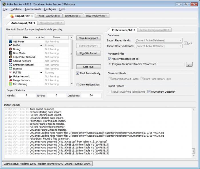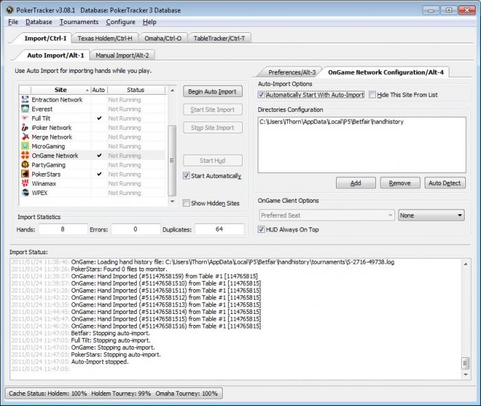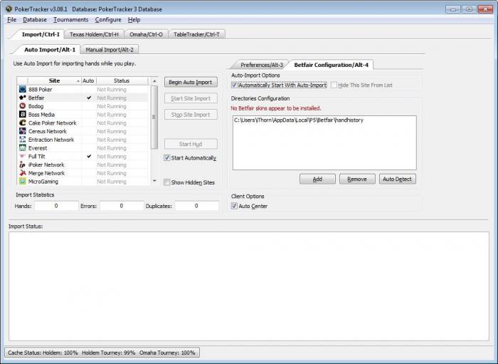 ОС Windows 7. Покертрекер при авто-настройке определяет handhistory для сети Ongame и соответственно авто-импорт для этой сети работает, но так-как клиент у меня Betfair, то HUD в нем не выводится. Прописал в ручную путь к папке со статистикой в C:\Users\iThorn\AppData\Local\P5\Betfair\handhistory, но импорт рук перестал работать, а HUD также ничего не показывает соответственно.