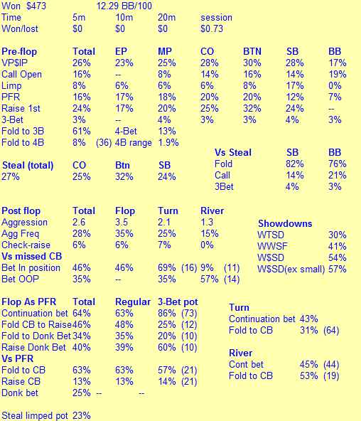 В этой же ситуации вообще ничего не понятно. У него не такие высокие проценты контбетов по улицам, а ставит он в тебя все 3 барреля. Наверное минрейз/фолд, но тут сложно найти оптимальное решение.