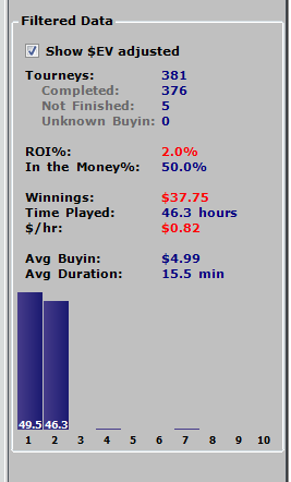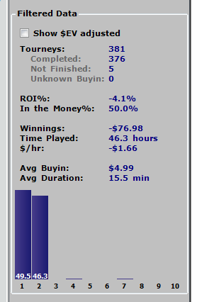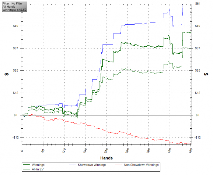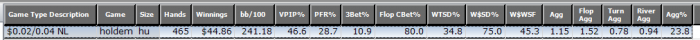 Hero wins $7.47 (net +$3.47) мне кажется, что я очень лузово играю, и пока не совсем понимаю диапазоны игроков, и мою агрессию по улицам никак не назовешь идеальной вот статистика, хотя наверное по такому количеству рук судить ни о чем, но тенденция на лицо