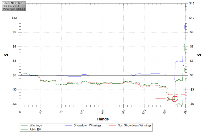 Проснулся и сел играть, вроде дел особых не было, открыл один столик и сел играть, опп чрезмерно агрессивным был, не удачным блефом отдал стек и сказал ему, что иду курить, он сказал: конечно! и с радостью стал ждать меня . Кружком помечен момент , когда затягивался сигаретой.