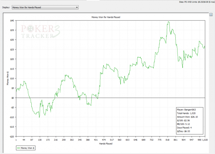 Сыграл длинную сессию в 13 часов на 10мах столах. Хоть я считал что 6мах привлекательнее для меня, но, видимо, пока учусь, стоит играть 10мах. Рыбы больше, вымывается дольше, сессии получаются длиннее и плюсовее.