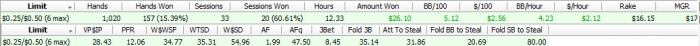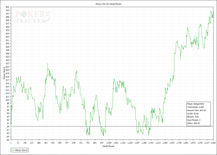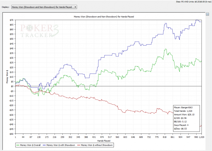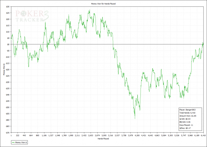 Начал отходить от низшей точки предыдущей сесии. Стал намного агрессивнее играть, такой разницы между вп/пр больше нет. Средние статы на 6мах сегодня были ~40/35. Такая игра больше мне подходит, когда удается разглядеть что стол стабильно отдает. После пары вскрытий блефов потом по полной проплачиваются натсы, с лихвой компенсируются потери плюс плюс :) :) :)