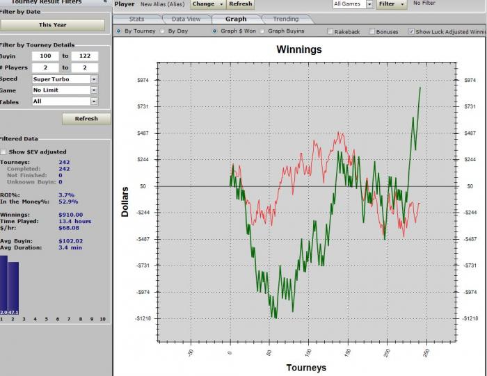 обычно я играю в ХА кеш-бамхант. Он немного надоел, хочу отвлечься. Чтобы играть было нескучно, предлагаю пари. Если играю 500 Superturbo FTP ($100 buy-in) в плюс вы платите 1000$, если в ноль или минус - я плачу 1400$