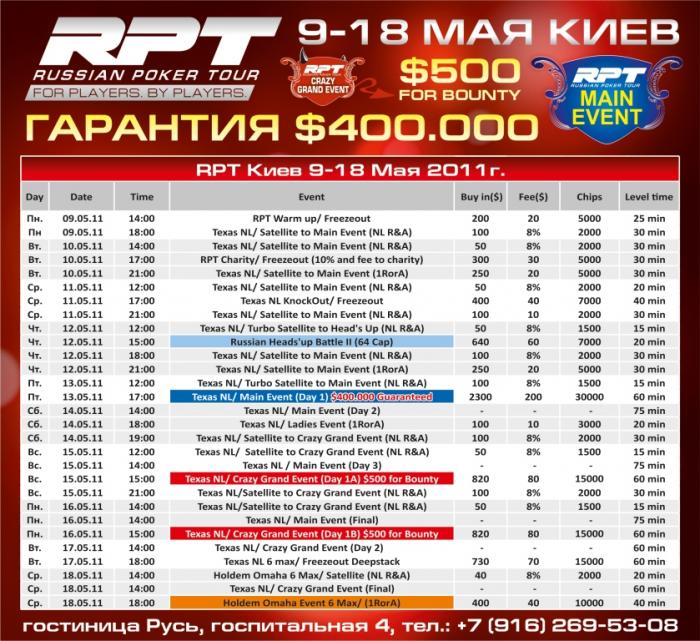 CRAZY GRAND EVENT $900 (820+80): стек 15.000!, уровни по 60! минут. Гранд ивент RPT, с первого раз показал себя очень интересным турниром. В Мае мы решили основательно добавить перчика в Grand Event. Формат Crazy Granda, мы переняли у PCA. В этом году он с успехом прошел на Карибских островах, и многие наши игроки с вдохновением рассказывали об участии в нем. Теперь попробовать на вкус такой формат сможем мы все, простые люди), кто не был на Карибах. Что же такого особенного? Теперь в Crazy Grand Event вы будете получать по $500 за каждого выбитого вами игрока! Т.е, выбив 2 игроков вы уже в плюсе. Обычно в Нокаут турнирах, на сам нокаут выделяется меньше половина байина, здесь же больше половины. Вы можете, даже, не попасть в призовую зону, но заработать больше чем призеры за счет выбитых игроков. Ожидаемое количество участников/входов около 400.