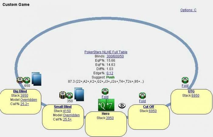 Ситуация: Допустим мы пихаем с баттона Q7s. Кол-во игроков за столом меняется. Сначала 9, потом 7, потом 5 и наконец 3. Диапазон приема у sb и bb не меняется зависимости от кол-ва игроков (в реальности кстати тоже мало меняется).