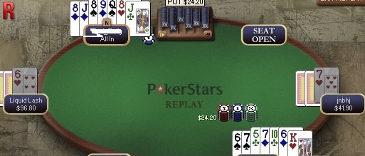5th Street: (2.75 BB) (2 players) Seat 2: xx xx T 9 6 ____Seat 2 calls Seat 6: xx xx J 7 A ____Seat 6 bets