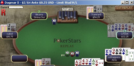 посмеятса это вот, решил заглянуть в аквариум 8-game, необходимость играть нелимитированные игры shorthanded напрягает конечно, но я посчитал даже если подарить там блайнды, оно окупиться с лихвой лимт-играми. вобщем это разз, перепутать игры он врядли мог, разз идет первым и он во все игры чудил, чувак нереально классно читает руки, на 5 я не захотел против него зарывать, на 6 зачем-то блефовал в него и получил ререйз ))) в итоге на ривере у меня оставалось 20 центов и я собирался пасануть на его ставку при шансх банка 1 к 121, но решил что не по-пацански и со стороны будет глупо смотреться.