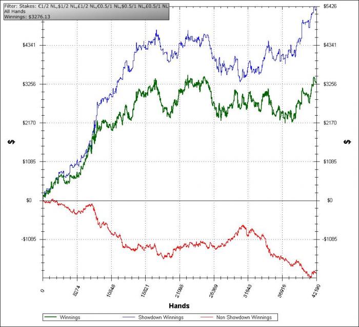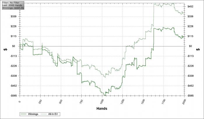 Что касается катки, то играю регулярно короткие столы нл100 и иногда нл200. Где-то на протяжении года с небольшим, пробовал и нл400 играть, но, к сожалению, есть кое-какие проблемы с дисциплиной и было несколько случаев когда я подзаливался на двухсотках, не в ноль конечно =) Вообщем, проблемы психологического и дисциплинарного плана мешают больше развиваться, нежели пробелы в понимании игры или неопытность там и т.д.