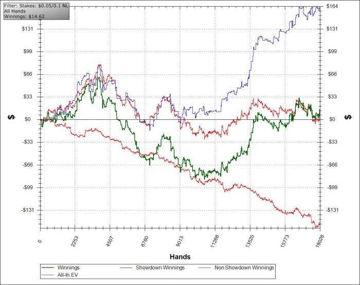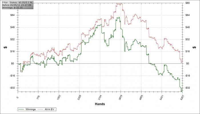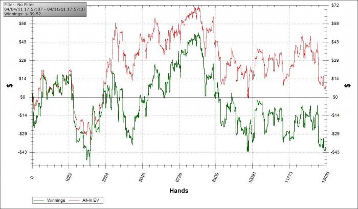 Наконец то я выполз из минуса! :) значит потихоньку я становлюсь ! Вчерашнее утро было, что-то!! Меня апнуло не плохо, но не надолго :((! Заходили сеты, проплачивали тузы. Ближе к вечеру решил еще одну сессию устроить, и тут уже все не так заходило, ни кто не хотел ни чего проплачивать. Попадал все время под доминацию, люди показывали верхушку своих диапазонов. Сегодня эта история продолжилась, очень плохо заходило. Пришлось несколько раз по раскачивать дисперсию сыграть коины( bu:мне АК) - BB меня 3 бет вот с такой статой 30vpip/22pfr/12-3bet, спокойно 4бет, а он AI с JJ. И таких раздач было достаточно. Но к счастью мне везло) Вот и итог по EV побежал в низ :(... Чувствую в себе уже уверенность, и готов рвать нл200! Уже мечтаю как бы побыстрее накалотить банкрол)