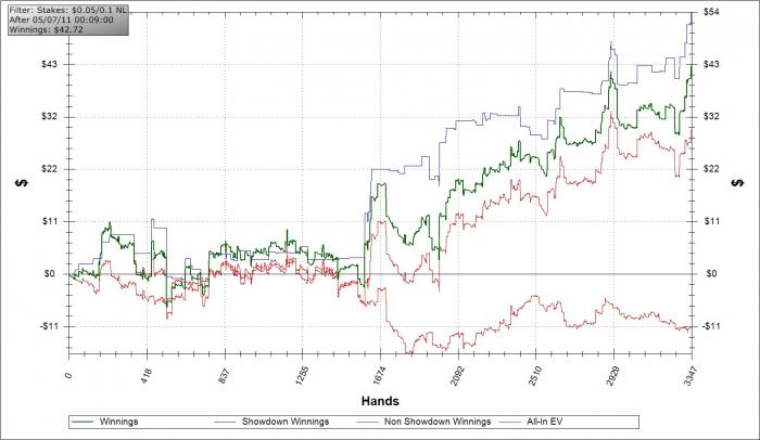 Ну и 7ого мая приступил к игре. Решил не гнаться за 12 столами. И играл я только на 6. Получилось как то так( результат за 2 дня игры ): Раздач:3347 Выйграл:42.72$ Выйграл по $EV30$ Рейк:26$ Потраченное время:5ч. 40мин.