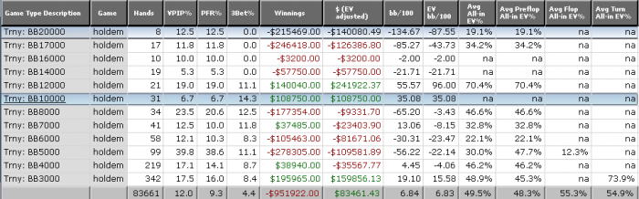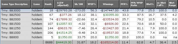 Ну для турниров в фишках смотреть бессмысленно. Ты можешь 30 раз переехать на блинах 15/30, а тебя переедут один раз, но на 15000/30000. И при этом будет у тебя стотыщмильённый недобор по фишкам.